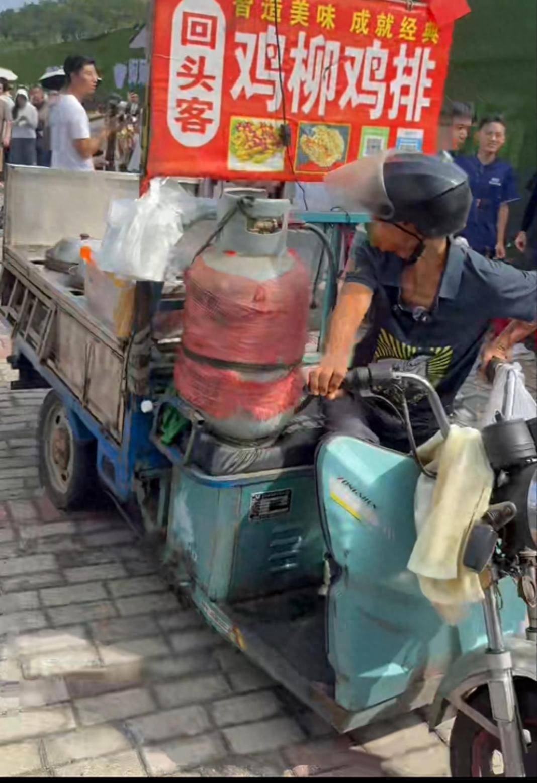 “鸡排哥”骑着三轮车到达现场